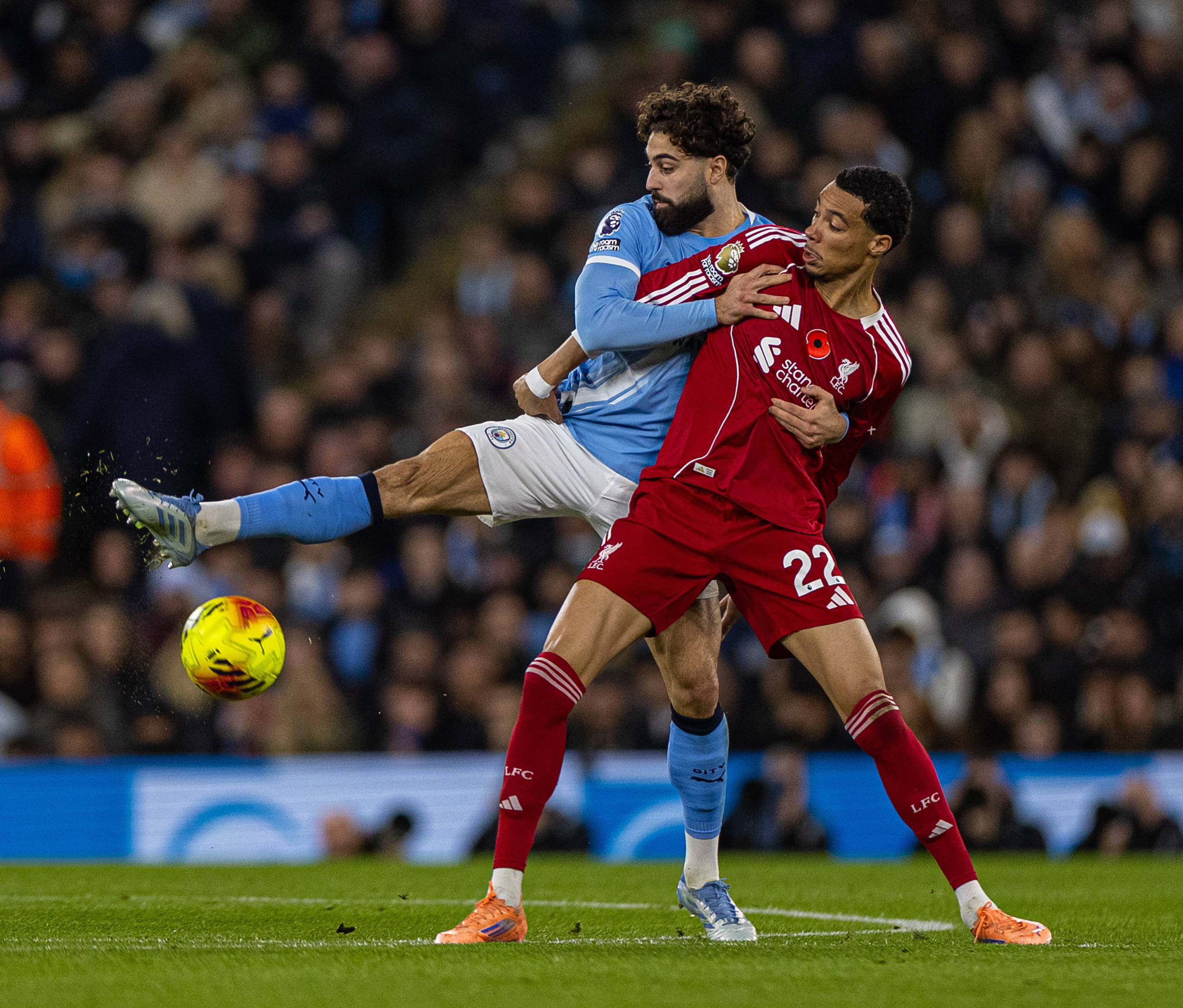 图为格瓦迪奥尔(左)在本赛季英超第11轮比赛中。新华社发23岁的格瓦迪奥尔在曼城4日主场战平切尔西的比赛中受伤。此役曼城的另又名主力中后卫鲁本·迪亚斯也因伤被换下,令球队的后防地雪上加霜。